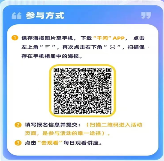 保存《安全护航成长、责任守护未来》二维码海报图片至相册,下载千问APP,用千问APP“扫一扫”,即可进入活动页面,填写信息并提交,跳转至活动页面参与学习(观看方法详见附件)。本次宣教公益大讲堂不收取任何费用。